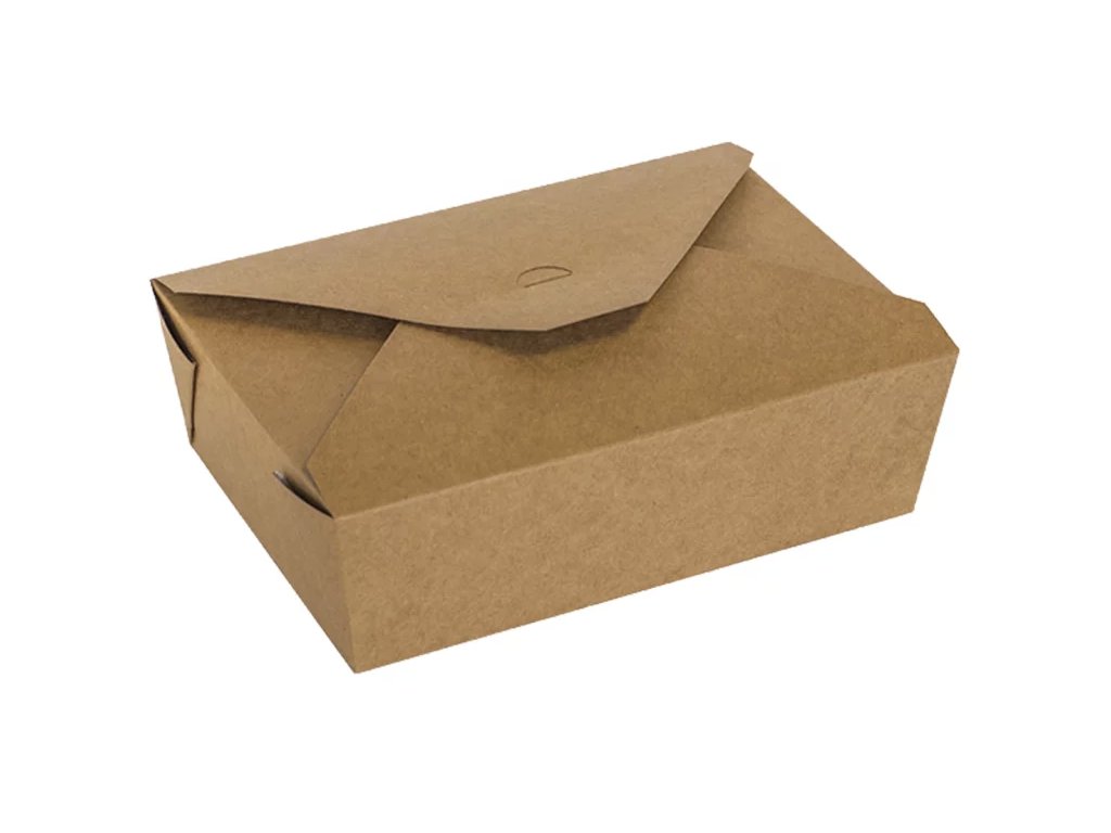 Lunchbox aus Papier (Kraft) mit fettdichter Oberflächenbehandlung.